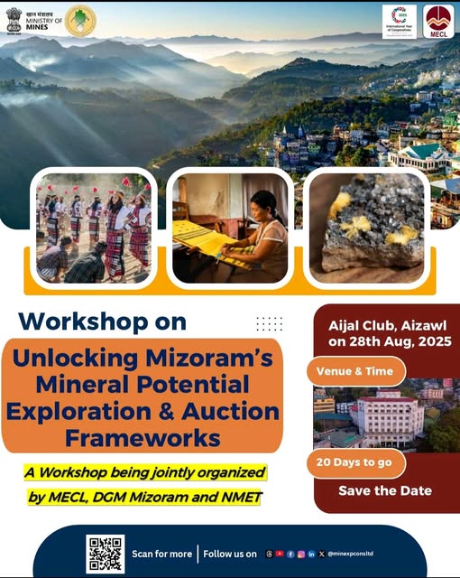 MECL, in collaboration with the Directorate of Geology & Mining, Mizoram, and the National Mineral Exploration Trust (NMET), is pleased to announce a one-day workshop in Aizawl, Mizoram on 28 August 2025.